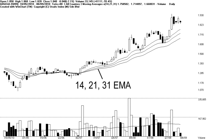 As shown on chart 4, price of Airasia precisely rebounded from the 14, 21, 31 EMA on the 13th of August, forming a higher low, thus suggesting that the uptrend is still intact. Therefore, as long as the 14, 21, 31 EMA is still supporting the uptrend, it is a good idea to remain in position, until price should break below the 14, 21, 31 EMA, then only it is a signal to take profit.